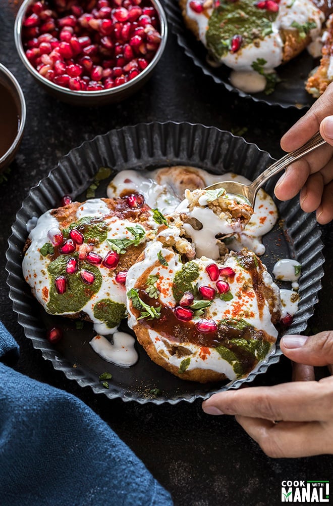 two aloo tikki served in a black rimmed plate and covered with yogurt, chutney and garnished with cilantro and pomegranate seeds
