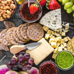 Condiments: My favorite part! For this cheese board, I made Spicy Strawberry Balsamic Jam (recipe below) and my favorite Cilantro Mint Chutney. Strawberries and balsamic pair great together in this jam which is spiced with some red chili flakes and black pepper. It goes so well the cheese! And of course I believe my cilantro mint chutney goes well with everything. These condiments also add a lot of color to the cheese board and make it look perfect for spring!
