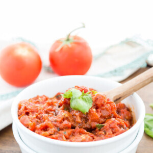 Arrabbiata is a spicy sauce and it is for this reason that I like using canned fire roasted tomatoes in this recipe. I love the one from Trader Joe’s but you can use any brand that you prefer. Make this chunky arrabbiata sauce over the weekend or whenever you have some extra time and then simply toss it over your favorite pasta on days when you are short of time to make