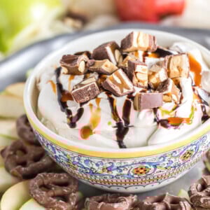 - Serve the Caramel Snickers Cheesecake Dip with apples, pretzels or anything else you fancy!