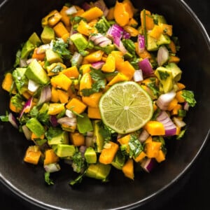 My house is literally full of mangoes these days. Last I counted, I had 15 of them and they were all pretty ripe. I made mango lassi, mango milkshake but was still left with a lot of them and so I made this quick Mango Avocado Salsa. It’s a great salsa for summers and also super easy to put together!