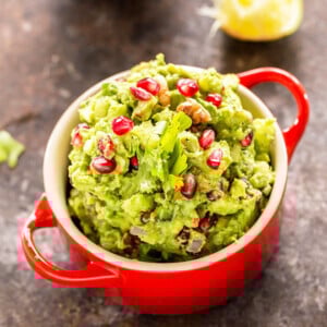 Few months back we took a trip to southern California and as you guys know there’s a heavy Mexican influence there. Literally for 3 days we only ate Mexican food. There were the traditional restaurants and then there were the not so traditional ones and it was at one of these fusion Mexican restaurants that I discovered this guacamole that I am sharing with you guys today. I don’t know what to call it so I am calling it festive guacamole because look at it, doesn’t it look super festive?