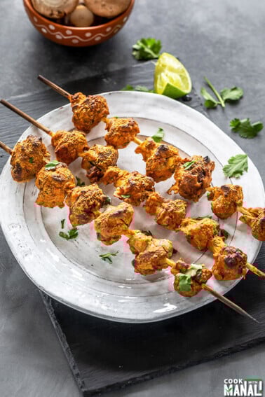 three wooden skewers of mushroom tikka arranged on a white plate and garnished with cilantro