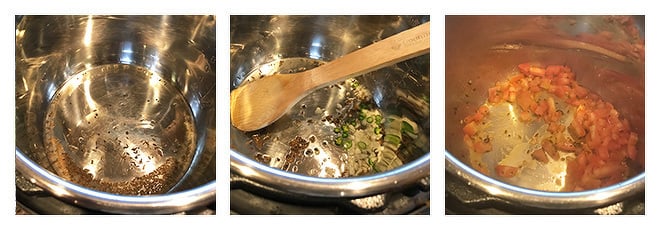 Wash and rinse the dals. Set aside. Press saute mode on Instant Pot. Add oil and once it’s hot add cumin seeds and mustard seeds. Let them crackle.
