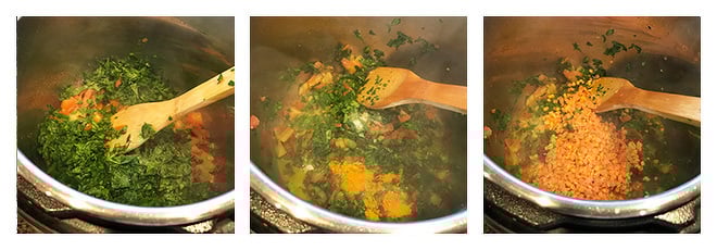 I would follow the same recipe, except add spinach at the end. After adding the dal cook for 30-35 minutes on stove-top until the dal is cooked and soft. Then add the spinach and simmer 5 more minutes and then add the final garam masala, salt and cilantro.