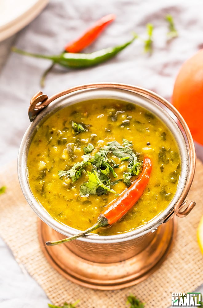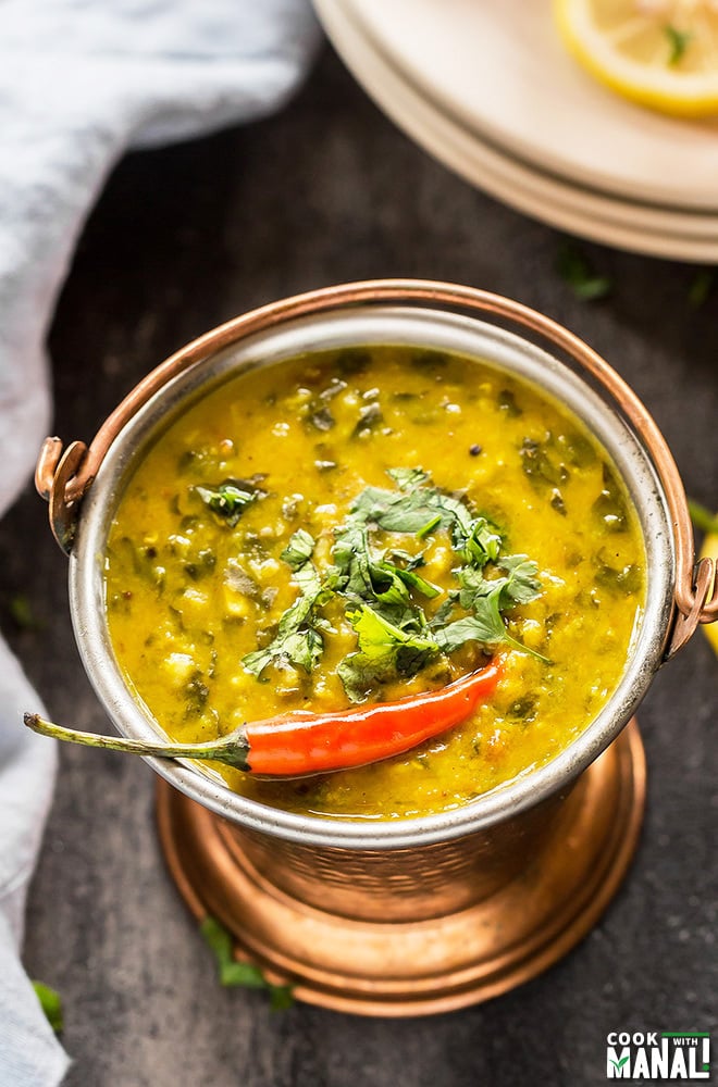 So the next recipe in the instant pot series is the Instant Pot Spinach Dal. I already have a spinach dal recipe on the blog and it’s actually quite a popular recipe so I thought I should share an instant pot version of it. And because you guys requested, I have also included a short video for this recipe. This spinach dal almost has a soup like consistency, that’s how we eat at our home. But if you don’t like it this cooked, simply reduce the cooking time by few minutes. I like this consistency best with plain rice, it’s so good!