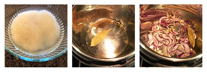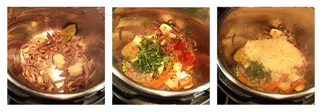 - Add ginger-garlic paste and cook for 1 more minute. Add 1 tablespoon water at this point and deglaze the pot. Scrape and remove all the burnt bits that may have been there due to sauteing the onions. Don't skip this step else the pot might not come to pressure.