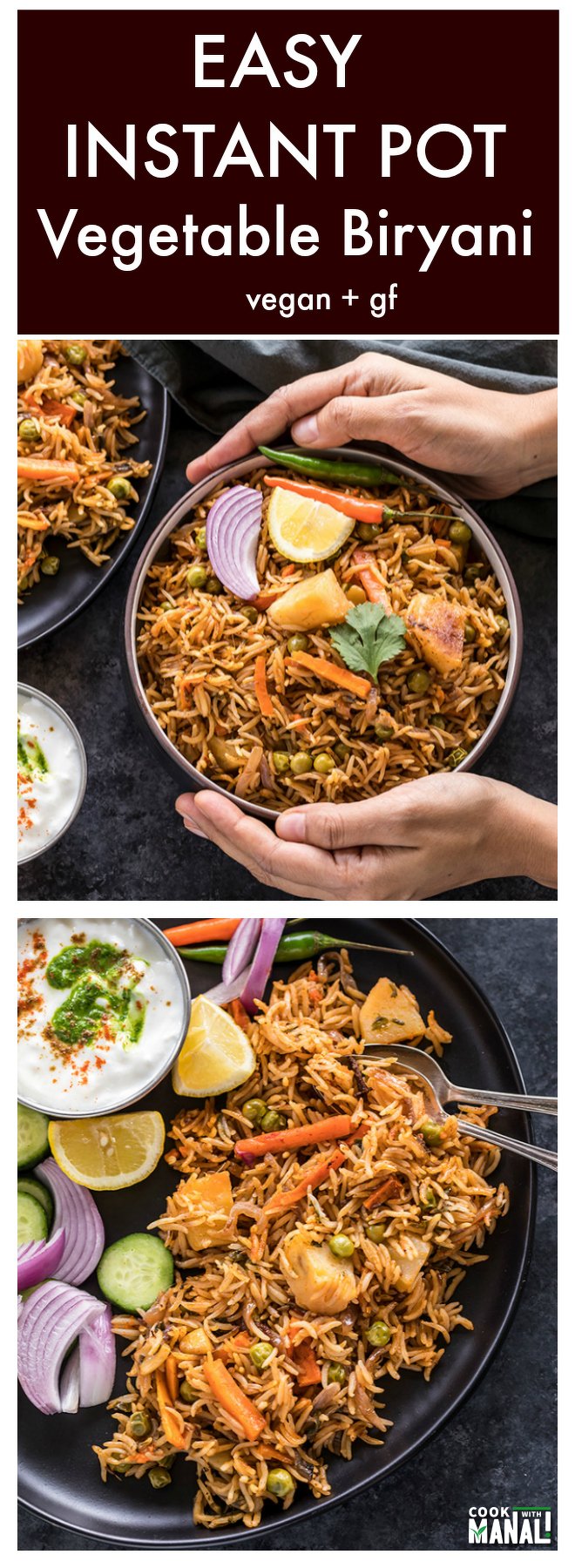 Easy Instant Pot Vegetable Biryani – fragrant basmati rice cooked with whole spices, herbs and vegetables. This easy biryani is packed with so much flavor, is also vegan and gluten-free. While it tastes great on its own, I enjoy it with a side of raita (yogurt dip).