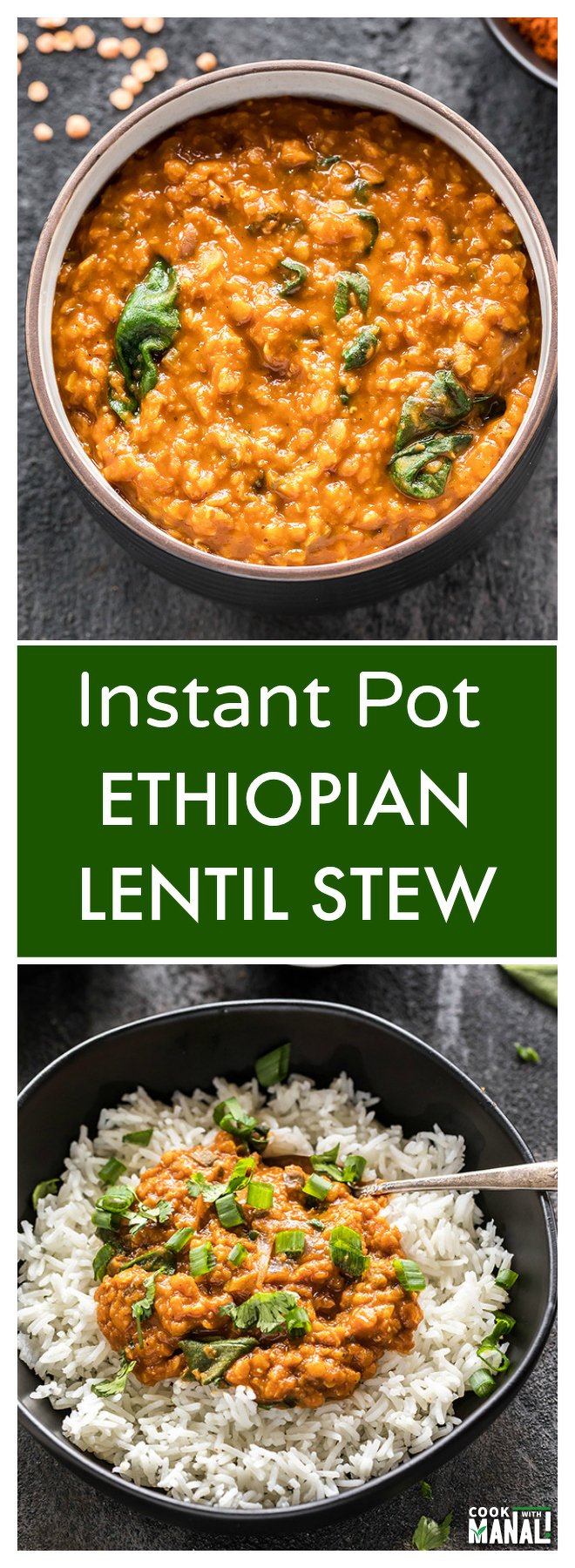 Ethiopian Lentil Stew made easy in the Instant Pot! This spicy red lentil stew is full of flavors and the addition of spinach makes it more nutritious! Vegan & gluten-free.