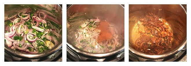 Press the saute button on your Instant Pot. Once it displays hot, add the oil and then add the chopped ginger, garlic, red onion & spring onion.