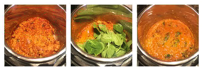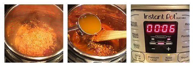 - Add the tomato paste, red lentils and stir for 30 seconds. Then add 1.5 cups vegetable broth and close the lid.